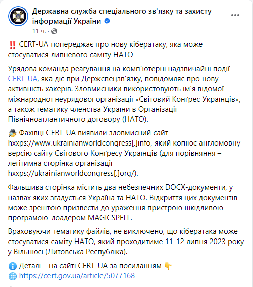 Государственная служба специальной связи и защиты информации Украины предупреждает о возможной кибератаке, которая может быть связана с саммитом НАТО в Вильнюсе и вопросом вступления Украины в Альянс.