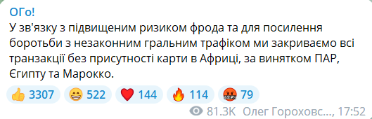 Транзакции без карты станут недоступными для пользователей Monobank, находящихся в Африке, за исключением стран, таких как Египет, Южно-Африканская республика и Марокко. Там услуги бескартового доступа останутся активными.
