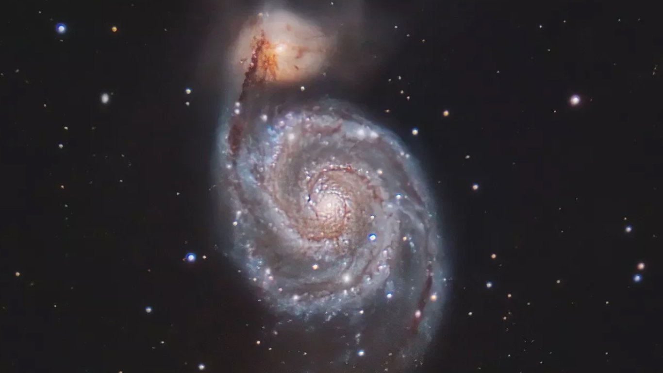 Издание отмечает, что Галактика Водоворот, также известная как M51, расположена на расстоянии около 23 млн световых лет от Земли, однако ее легко можно увидеть в телескоп или даже бинокль. Галактика находится в созвездии Псов Охотников и состоит из двух спиральных рукавов, вращающихся друг вокруг друга.