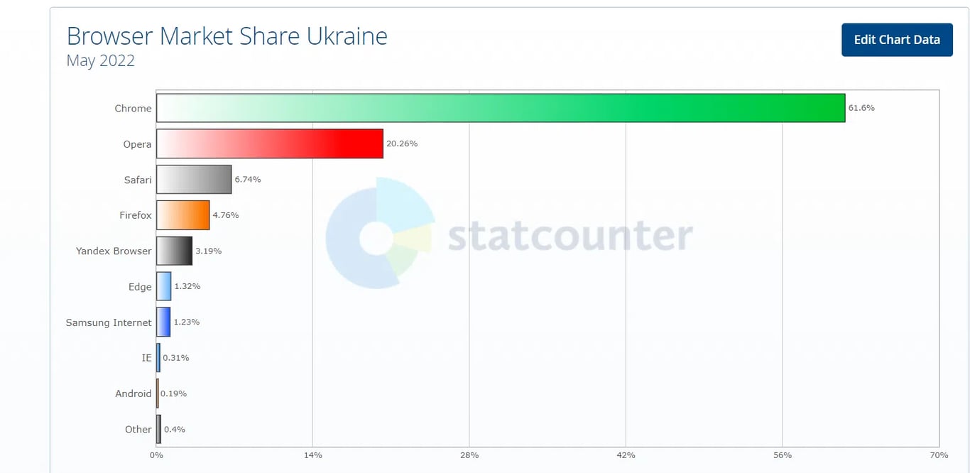 Отмечается, что Google Chrome немного набрал себе украинских пользователей — почти на 4%. Норвежский Opera несколько потерял – на 11%. Однако еще в марте текущего года доля пользователей составляла 18,59%.
