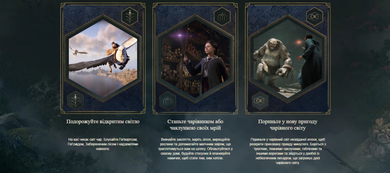 На сайте Hogwarts Legacy можно выбрать украинский вариант отображения информации. Соответствующая страница содержит описание игры на украинском языке, имеет ссылки на другие страницы (например, описание системных требований для ПК или описание эксклюзивных вознаграждений), которые также изложены на украинском языке.