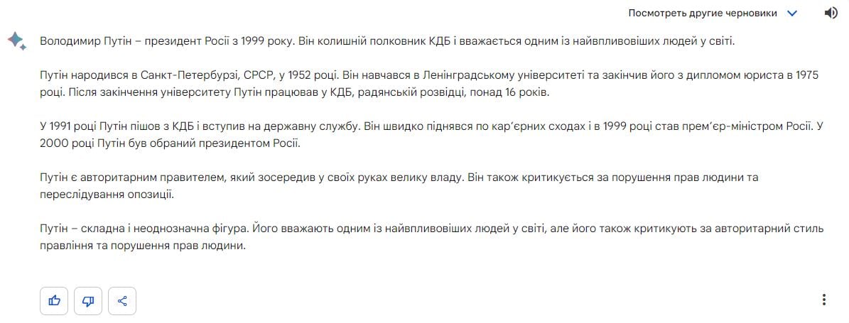 "Путін — складна і неоднозначна фігура. Його вважають одним із найвпливовіших людей у світі, але його також критикують за авторитарний стиль правління та порушення прав людини", — сказав Bard.