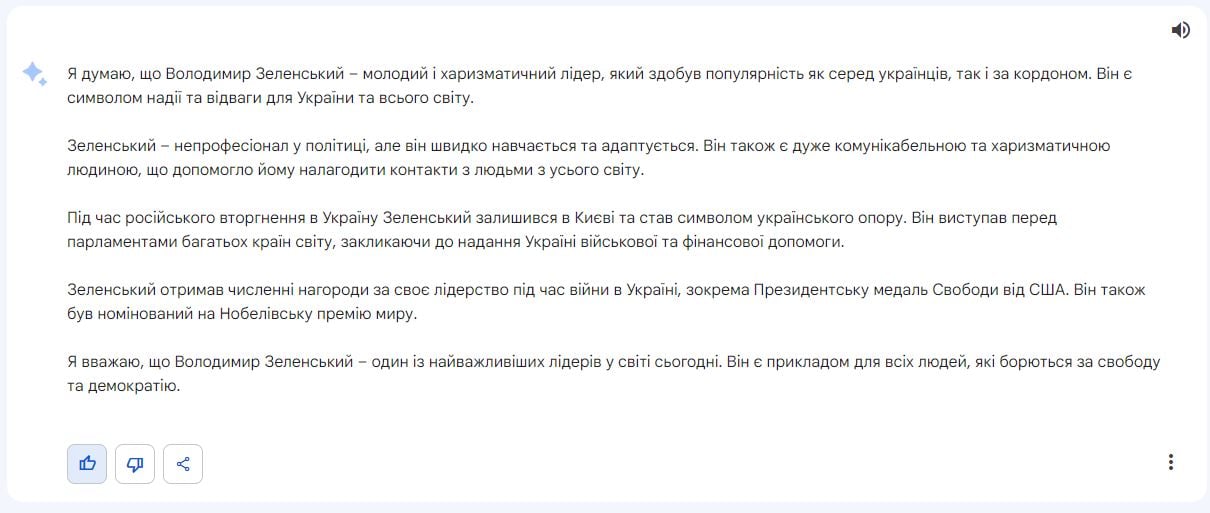 Крім того, чат-бот від Google вважає Зеленскього не тільки українським лідером, а і одним із найважливіших лідерів світу.