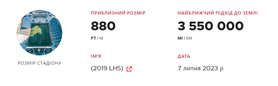 7 липня величезний астероїд розміром зі стадіон під назвою 2019 LH5 пролетить повз нашу планету на відстані 3,550 000 кілометрів.