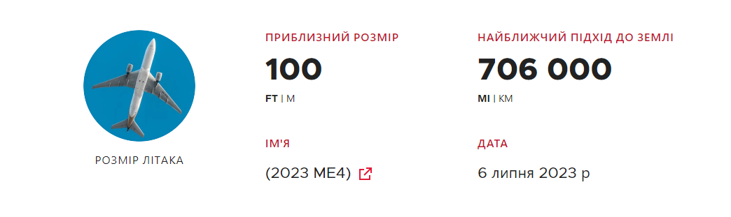 6 липня до нашої планети наблизиться астероїд 2023 ME4. Його розміри можна порівняти з габаритами літака. Максимальне зближення із Землею 706 тисяч кілометрів.