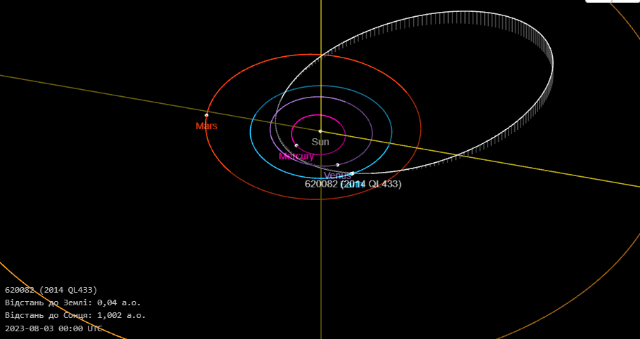 Вже цієї п’ятниці, 4 серпня, поблизу Землі пролетить астероїд 620082 (2014 QL433). За даними NASA, довжина небесного об'єкта становить близько 366 м.